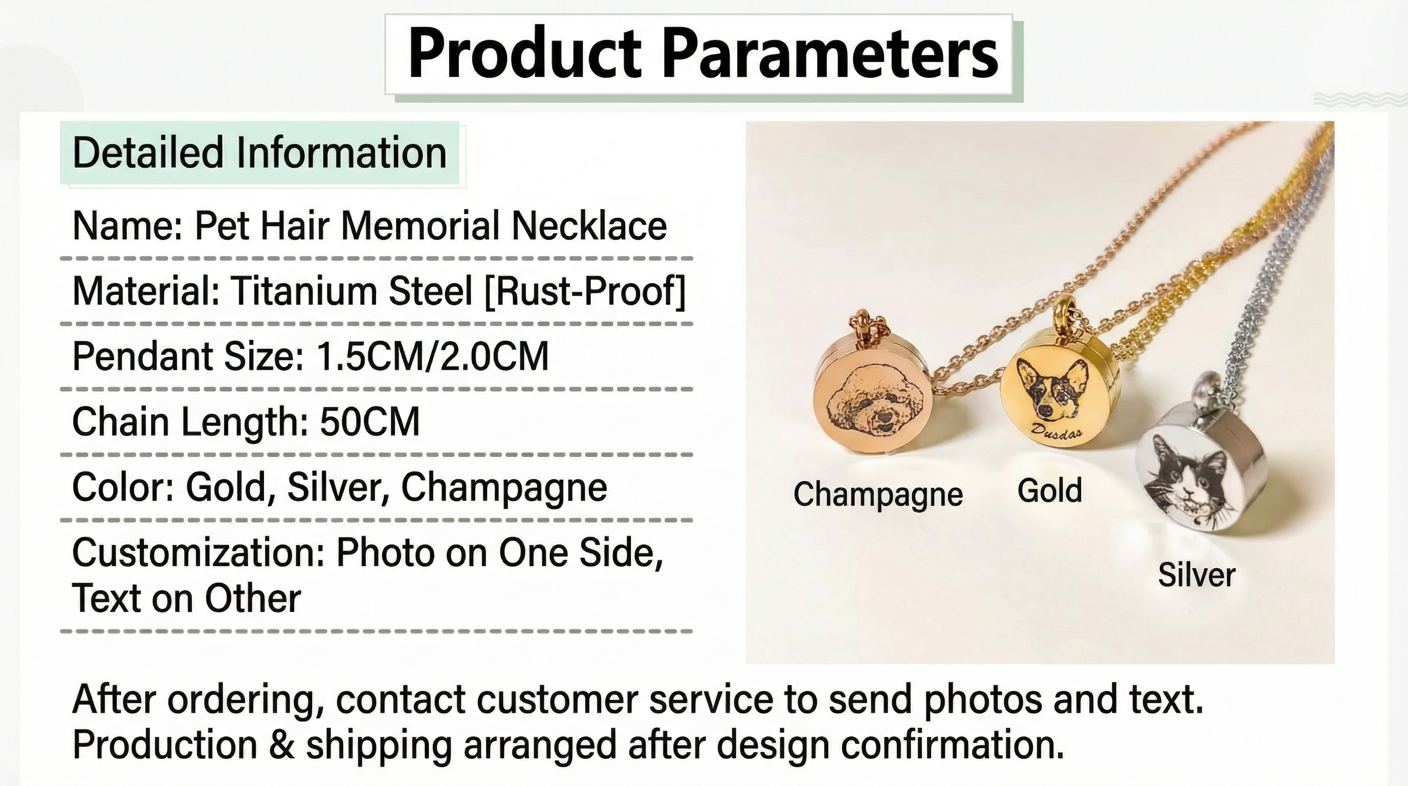 Custom Pet Hair & Ashes Memorial Bracelet – Handcrafted to Keep Them Near Carry a piece of your beloved companion wherever you go with this custom memorial bracelet. Featuring an openable locket designed to hold pet hair, teeth, or ashes, each piece is engraved with a unique hand-drawn portrait of your pet on the front and a personal message on the back. Made from durable, rust-proof 316 titanium steel with an adjustable fit (15–20cm). ⚠️ Important: Because each bracelet is custom-made, production and shipping times are longer than standard items. After ordering, you must email your pet’s photo and engraving text to host@goldenleafcreation.com to start the design process.